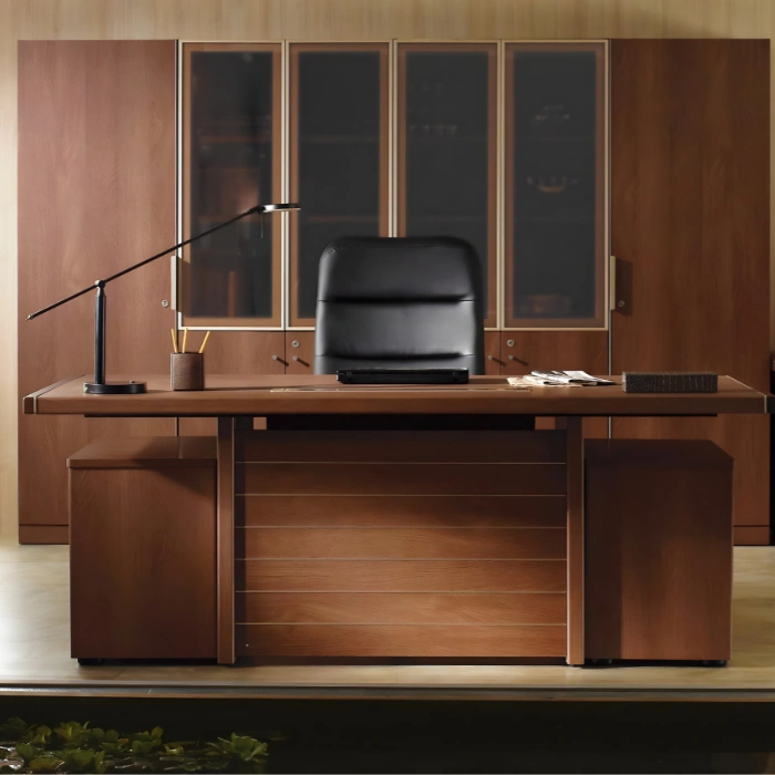 Modern Executive Design: The Apex executive desk brings a touch of luxury to any office, featuring a stylish combination of wood paneling and minimalist design that enhances your workspace.