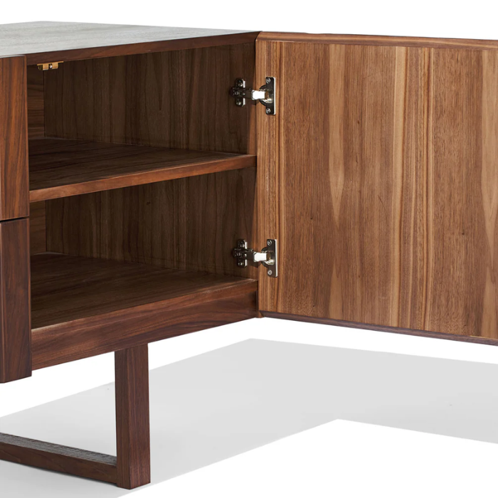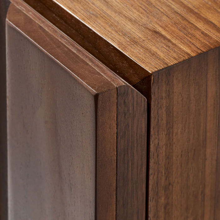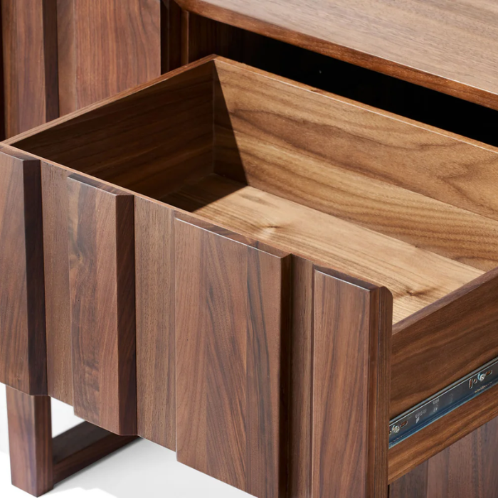 The Aural Console Table features an elegant walnut finish, which is enhanced by the richly toned walnut veneer and solid walnut legs. This luxurious natural finish adds warmth and character to any space. The unique three-dimensional geometric design of the table body brings an artistic touch, giving your home a modern and refined look. The open-ended legs create an airy flow, accentuating the table’s textural elements and contributing to its sleek, minimalist silhouette.