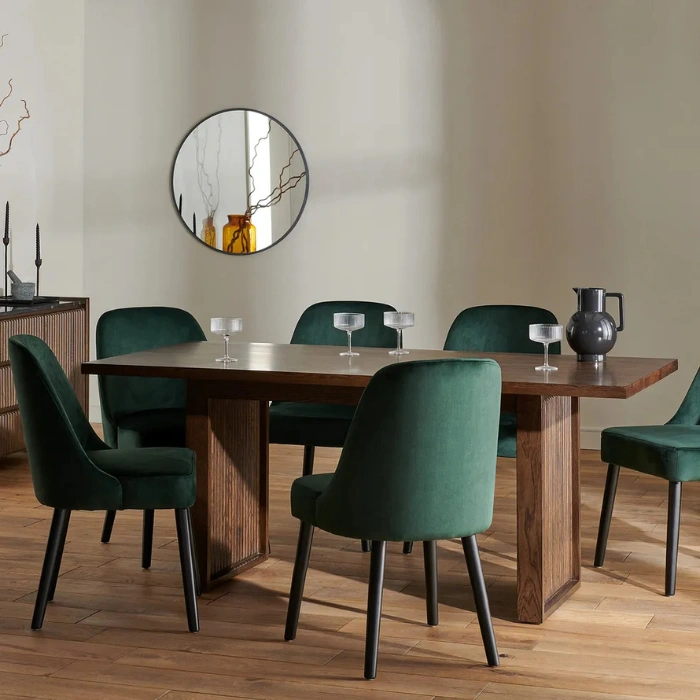 This set includes 6 chairs, finished in a deep green velvet tone that instantly lifts the room. If you’ve been searching for velvet dining chairs, this is exactly the look people mean when they say “luxury dining.”
