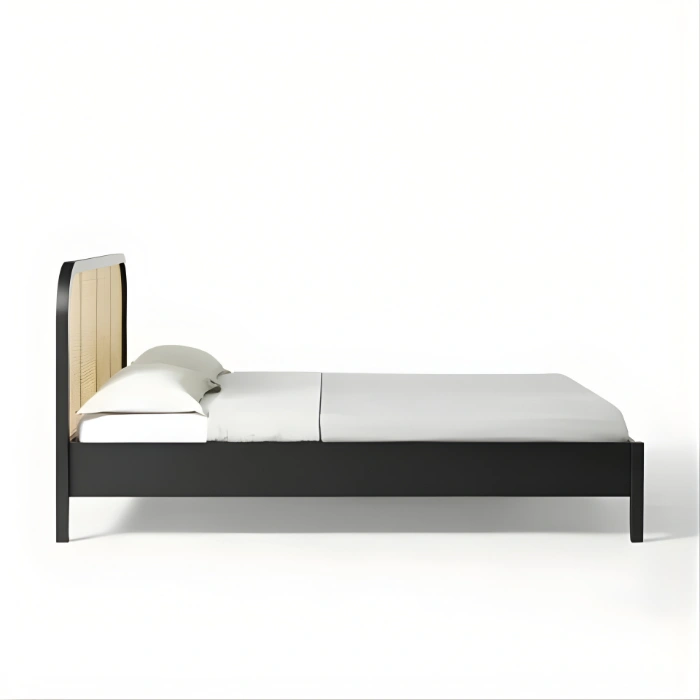 - Centerpiece black cane bed with gently arched headboard and low platform profile