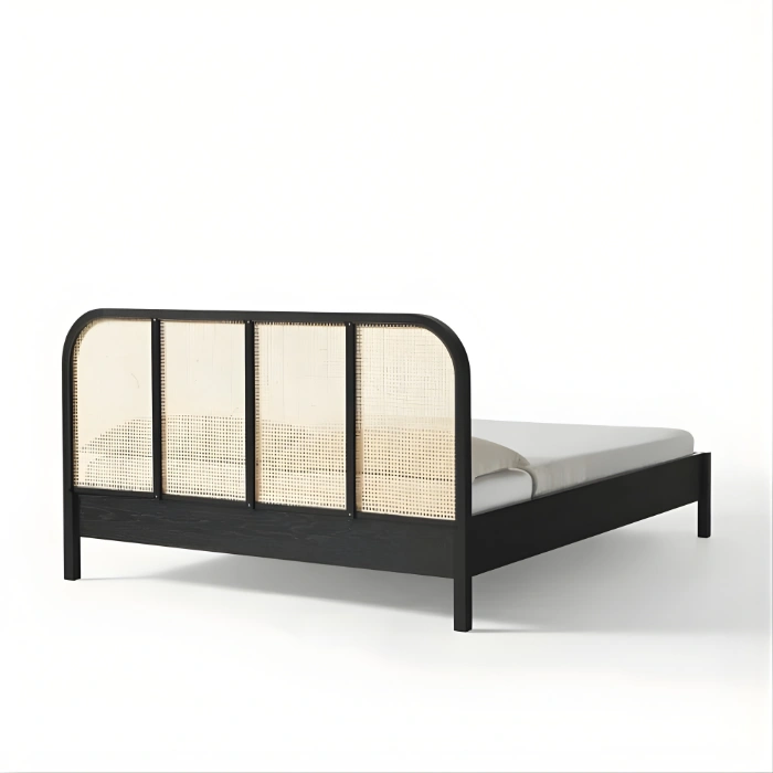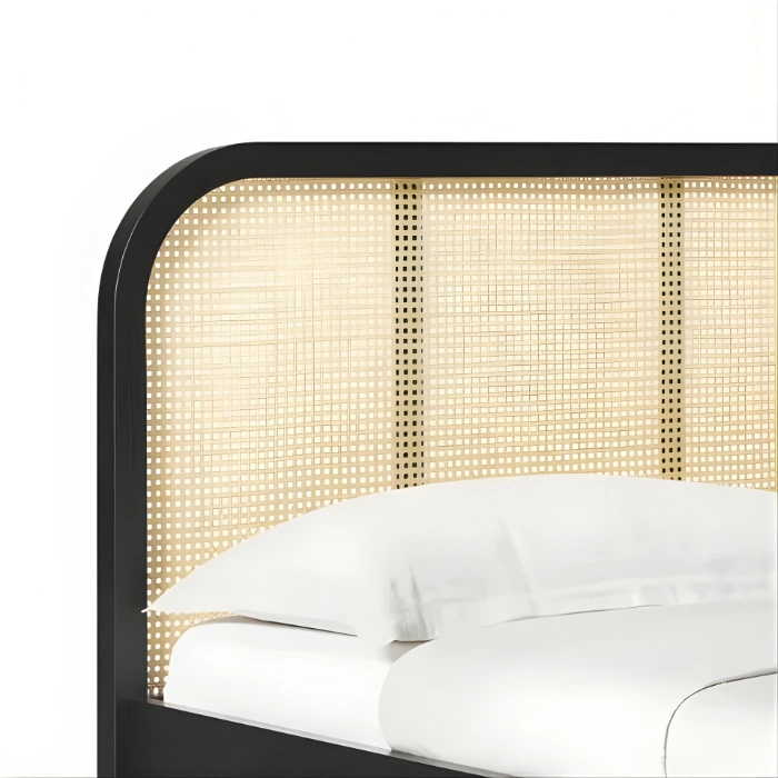 Modern minimalist, boho chic boho bedroom set pakistan, Scandinavian, and japandi bedroom furniture – elevated by clean black frames, natural cane texture, and simple lines.