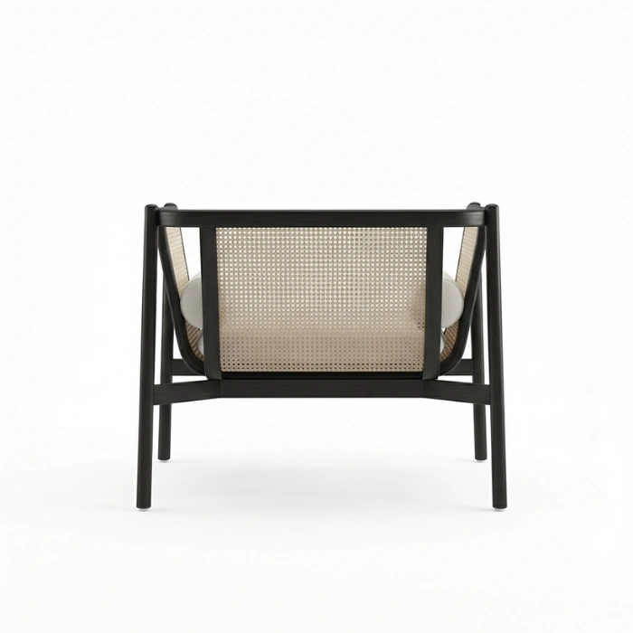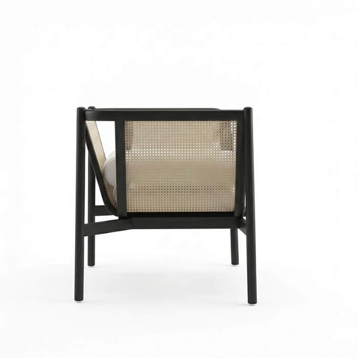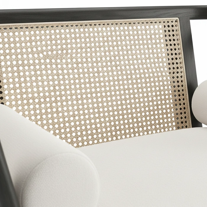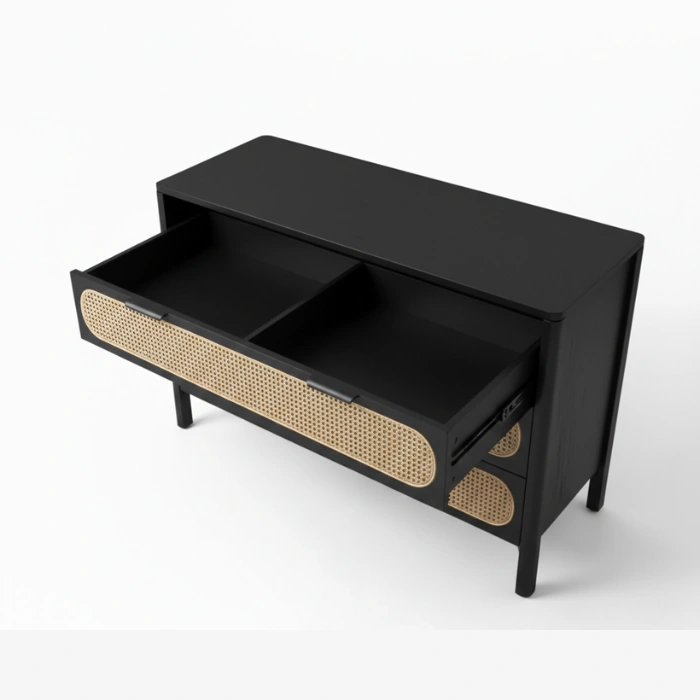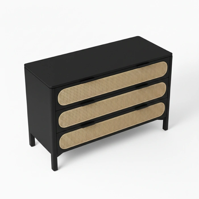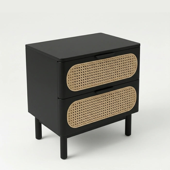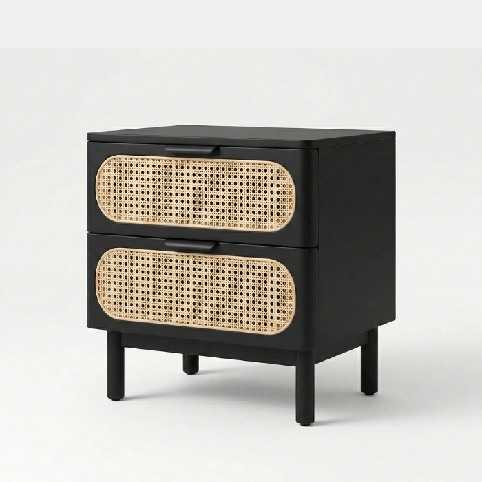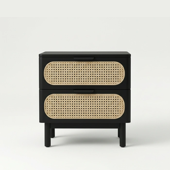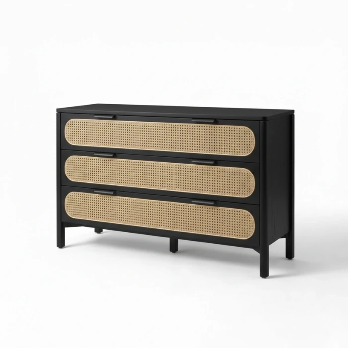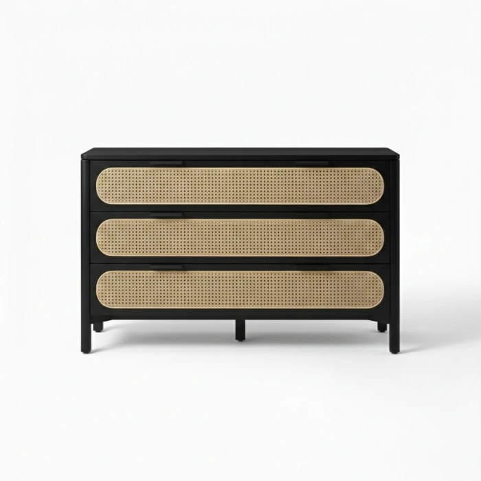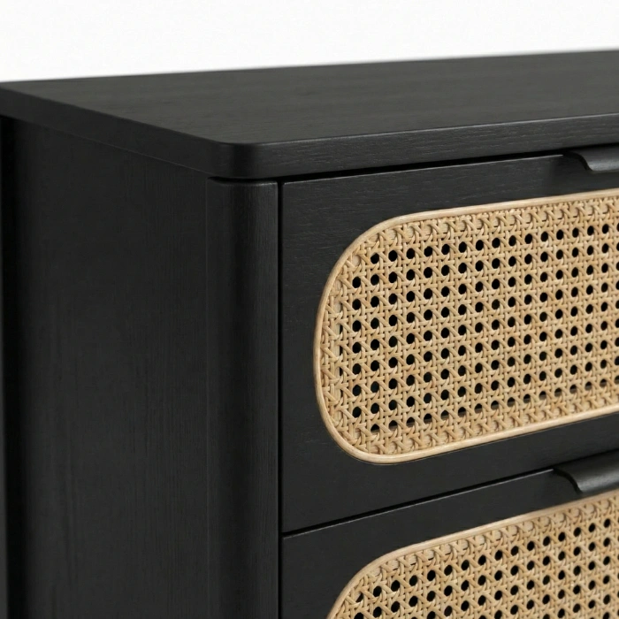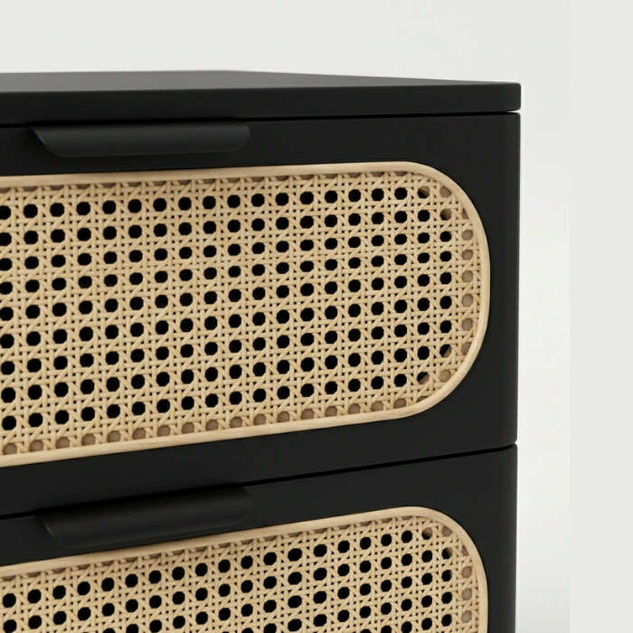 Solid wood frames in durable matte black finish pair with handwoven natural cane for lasting quality. Smooth rounded edges, reinforced joints, and low-VOC finishes prioritize safety and sustainability. Breathable cane promotes airflow, soft-close drawers ensure quiet operation, and the cushioned chair invites relaxation. Easy-clean surfaces and a neutral palette simplify long-term styling.