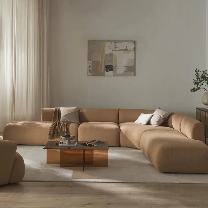Upgrade your living room with the Cavo Curve Sofa, featuring a cozy bouclé finish, modular design, and organic curves for timeless modern elegance.