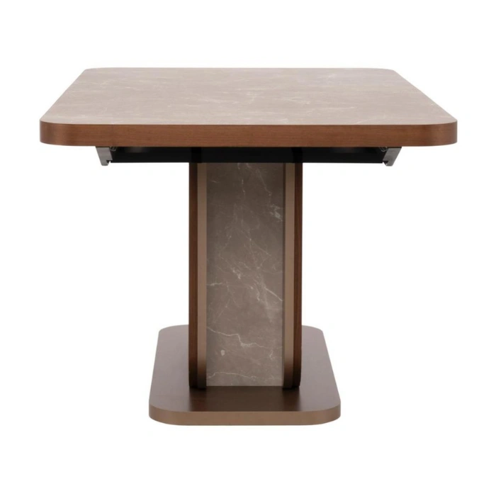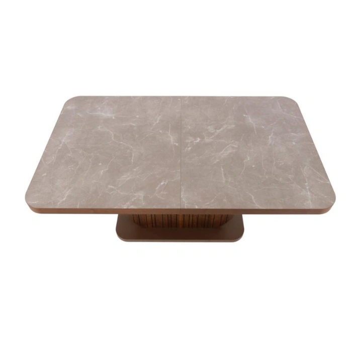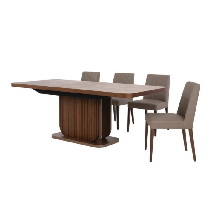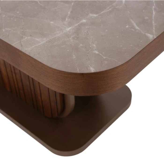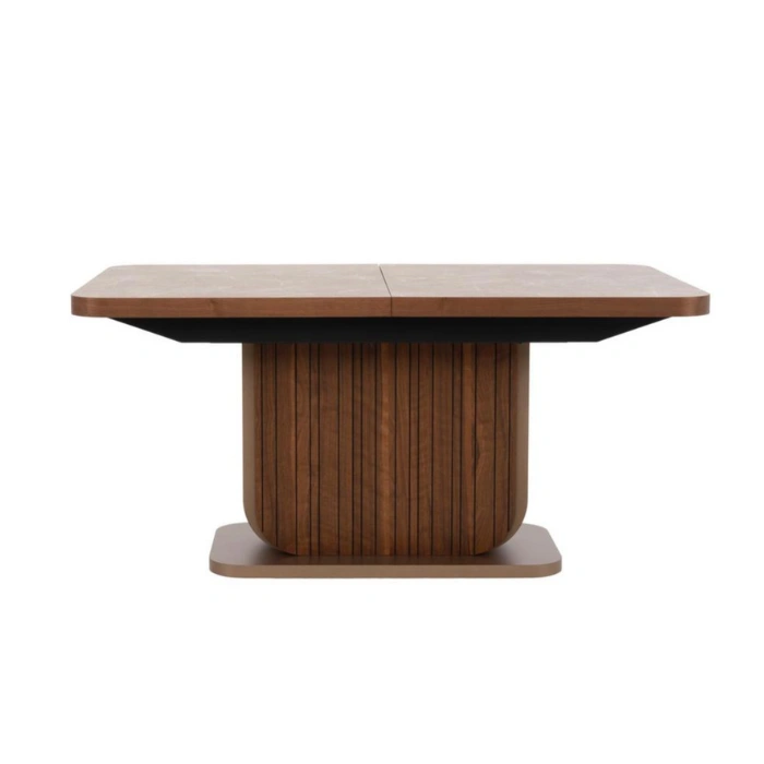 Fluted Pedestal Base: Sturdy engineered wood base with a rich walnut veneer adds visual depth and modern texture.