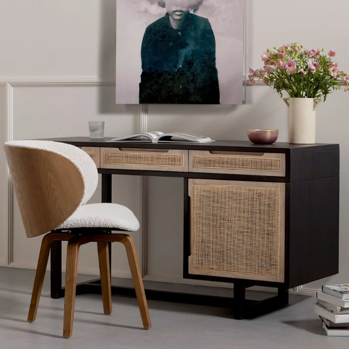 Add timeless elegance to your workspace with the Delilah Cane Desk, featuring handwoven cane panels, a solid wood frame, and ample storage for a stylish and functional office solution.