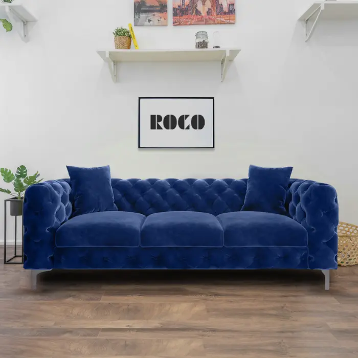 The Gorten Velvet Sofa features premium velvet upholstery, offering a smooth, soft-to-touch fabric with a rich texture. Available in a variety of colors, including stunning blue velvet options, this sofa adds a luxurious feel to any room. Built with a solid hardwood frame, the sofa ensures durability and longevity, with deep-button tufted cushioning that enhances the classic design while providing plush seating. The high-density foam cushions offer lasting comfort and support, making this sofa perfect for both relaxation and entertaining. The elegant curved arm design adds to the refined silhouette, blending effortlessly with your existing décor. Additionally, the strong wooden legs offer excellent stability while providing easy floor cleaning access.