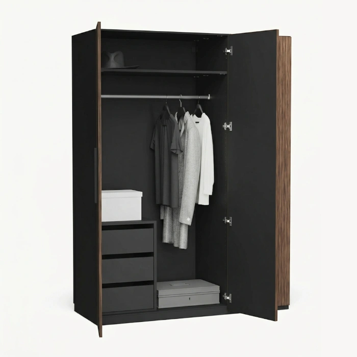 Behind the elegant fluted doors lies a highly organized interior, perfectly tailored to keep your garments pristine and accessible.