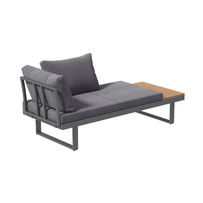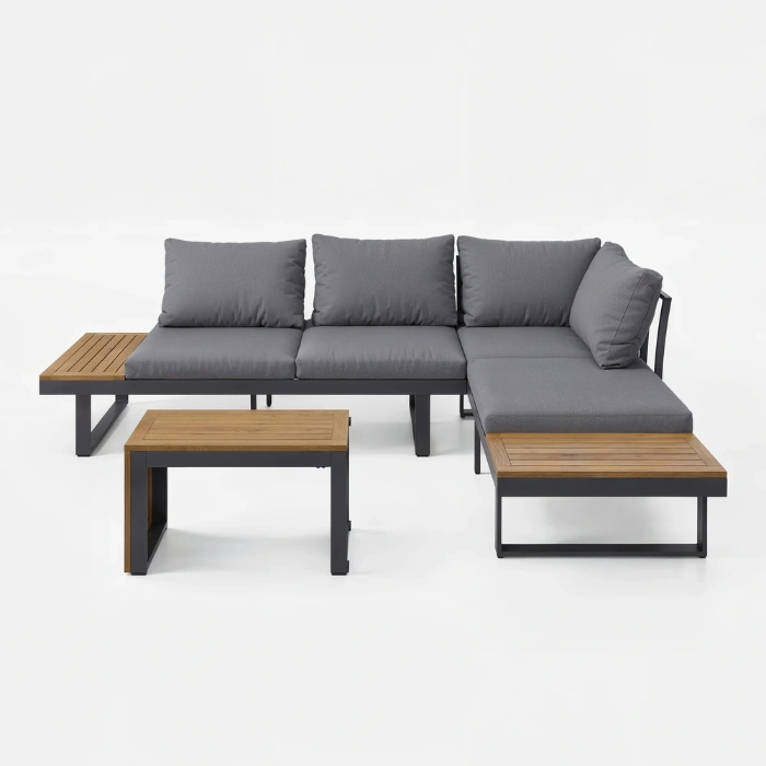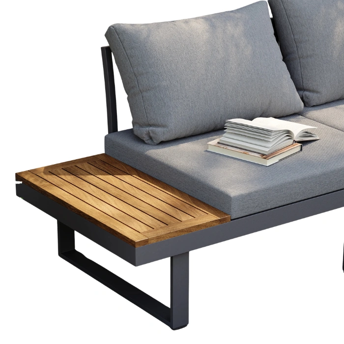 - Integrated side tables and the matching coffee table feature high-quality polywood that resists cracking, rotting, and peeling.