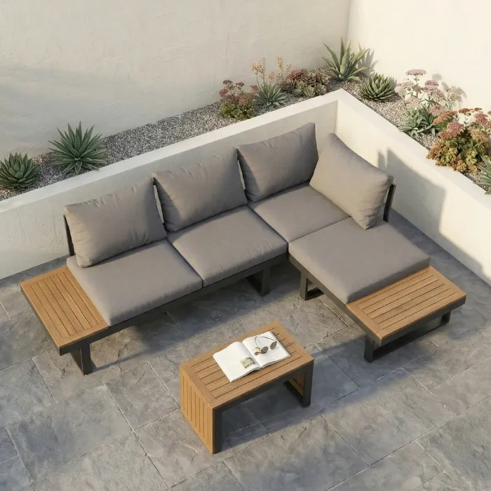 When investing in outdoor seating furniture, long-lasting durability is essential. The Kade collection is built around a premium outdoor aluminum sectional sofa frame, ensuring a lightweight foundation that is entirely rust-resistant while boasting an impressive weight capacity of up to 880 lbs. The seating is paired with UV and water-resistant polyester fabric, ensuring your weather resistant outdoor furniture stays looking pristine season after season.