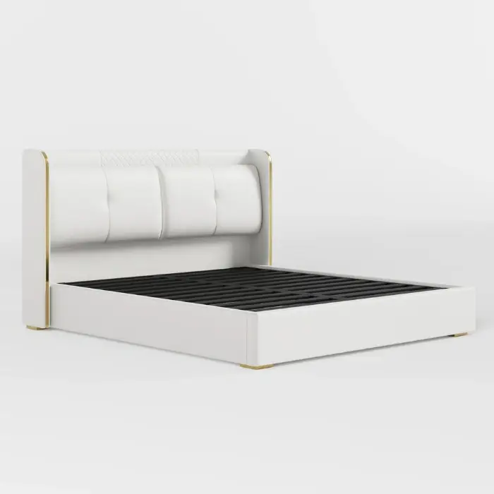 The Linea Bed blends a boutique-hotel vibe with real-life comfort: off-white, soft-touch upholstery, plush panel headboard, and refined gold accents. A quiet slat platform supports your mattress, no box spring needed, while the rounded corners and wrapped base keep the look calm and contemporary. If you’re browsing upholstered beds, this design stands out for its sink-in backrest and easy-clean finish that styles beautifully with any palette.