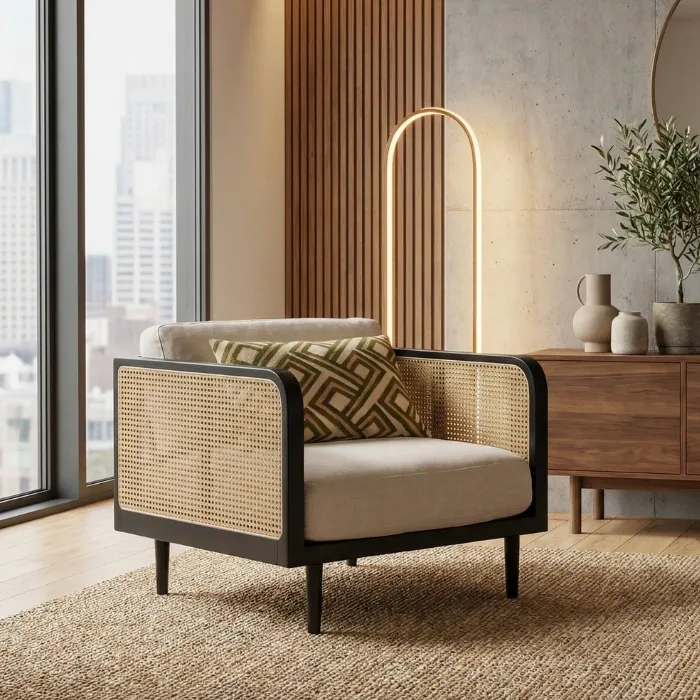 The chair is built on a solid wood frame, giving it strength, stability, and long-term reliability. Natural rattan cane panels on the sides add visual lightness while improving airflow, making the chair comfortable even in warmer weather.