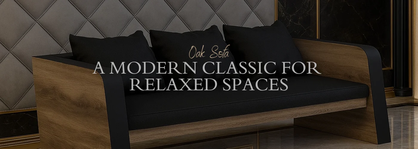 Create a welcoming executive lounge with the Oak Sofa. This modern 3-seater pairs a warm wood-grain frame with deep-black cushions for a sleek, professional look. Gently curved side panels and crisp edges give it a contemporary profile that fits beautifully with modern office furniture in Pakistan—perfect for reception areas, cabins, and meeting lounges.