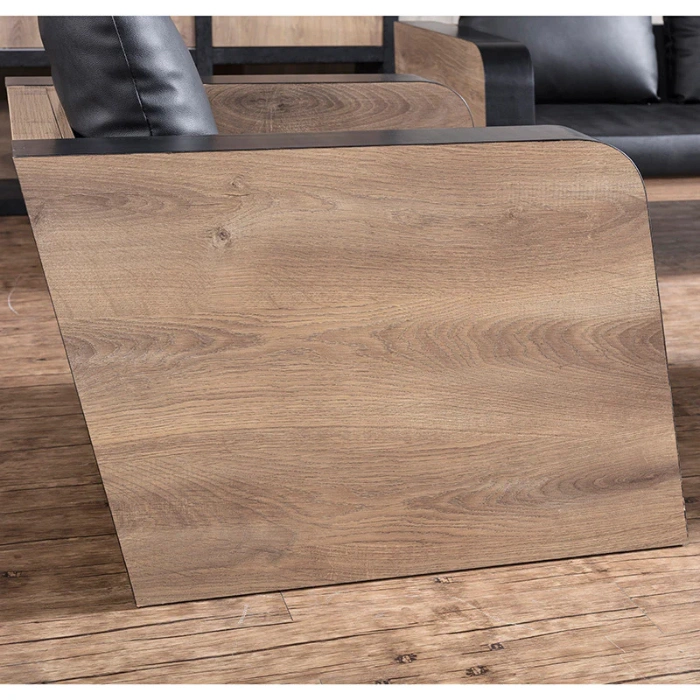 Create a welcoming executive lounge with the Oak Sofa. This modern 3-seater pairs a warm wood-grain frame with deep-black cushions for a sleek, professional look. Gently curved side panels and crisp edges give it a contemporary profile that fits beautifully with modern office furniture in Pakistan—perfect for reception areas, cabins, and meeting lounges.