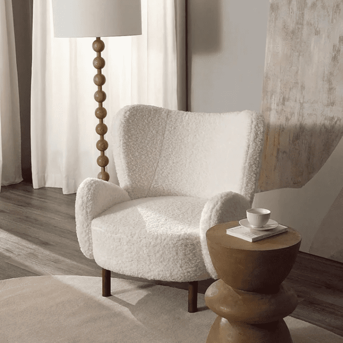 Unwind in style with the Pebble Lounger chair featuring a cozy teddy cover, firm foam comfort, and a modern wingback design, perfect for any Pakistani home.