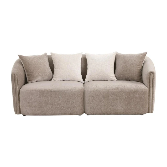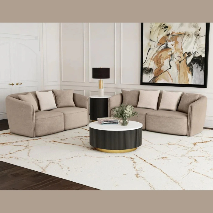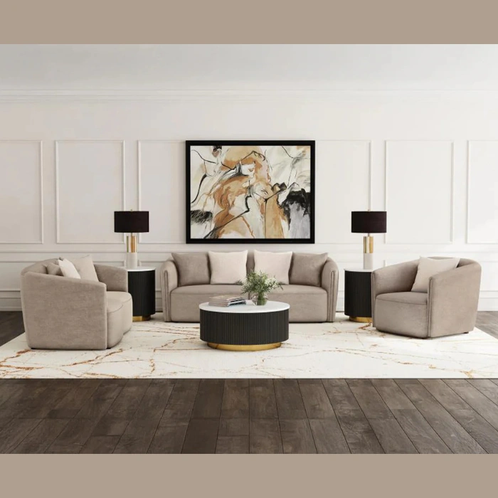 The Plush Living Room Set brings a sense of calm, comfort, and refinement to any home. With its soft upholstered texture, sculpted curves, and warm neutral tone, this collection is designed to create a space that feels both elegant and inviting.
