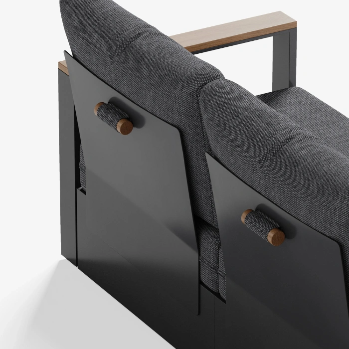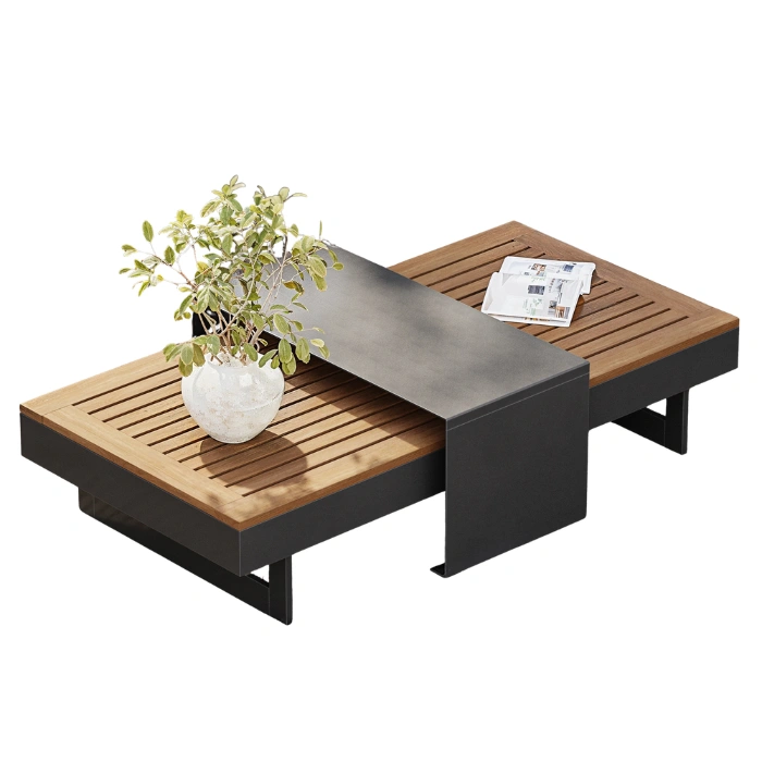 A sleek white metal frame needs warmth, so we added beautiful slatted detailing on the wide armrests and the matching central coffee table. Instead of natural wood that rots or attracts termites, we used high-grade Synthetic Wood (Polywood). You get the gorgeous, natural aesthetic of real timber, perfectly suited for holding your evening snacks or coffee, with absolutely zero maintenance, sanding, or polishing required.