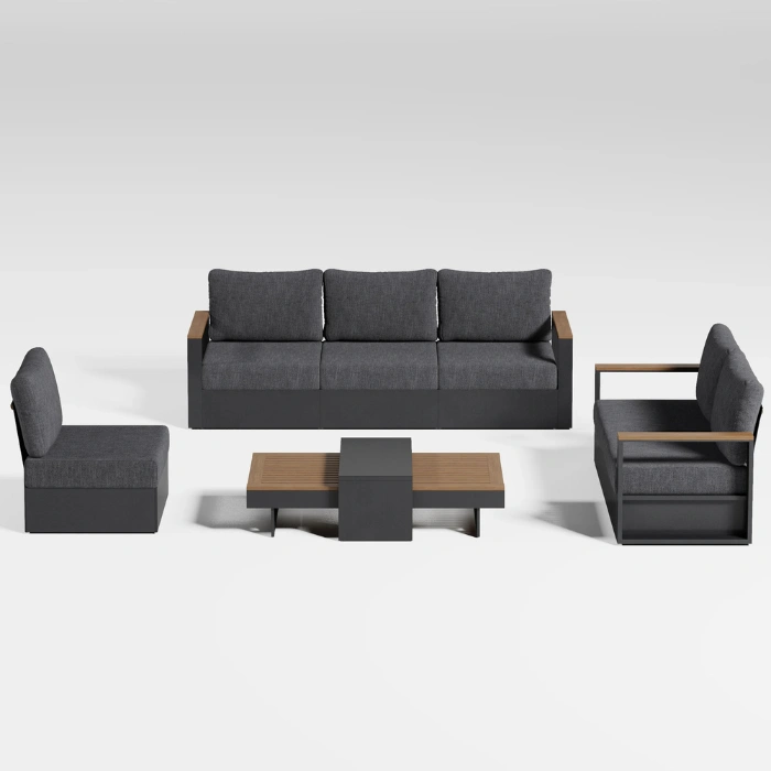 Designed to accommodate the whole family, the Reefline is a complete 6-seater configuration. It includes a generous 3-seater sofa, a cozy 2-seater sofa, and an oversized single lounge chair. The thick, plush seat and back cushions are crafted from high-density foam, giving you a premium indoor living room feel, but built strictly for the outdoors. Wrapped in a durable, water-resistant grey polyester fabric, accidental drink spills or unexpected drizzle are easily managed.