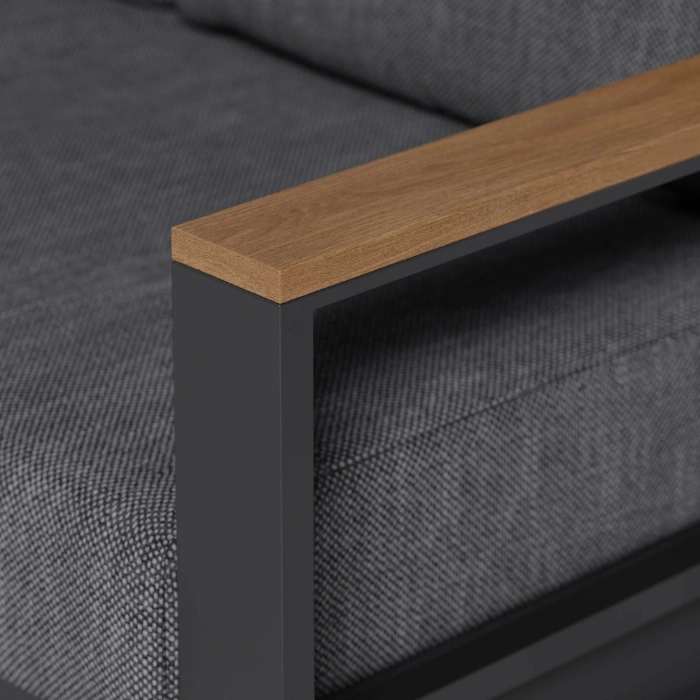 close view of sofa armrest showing teak top wood